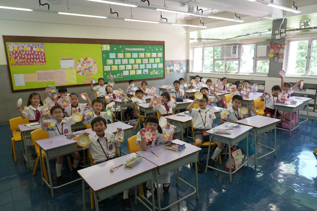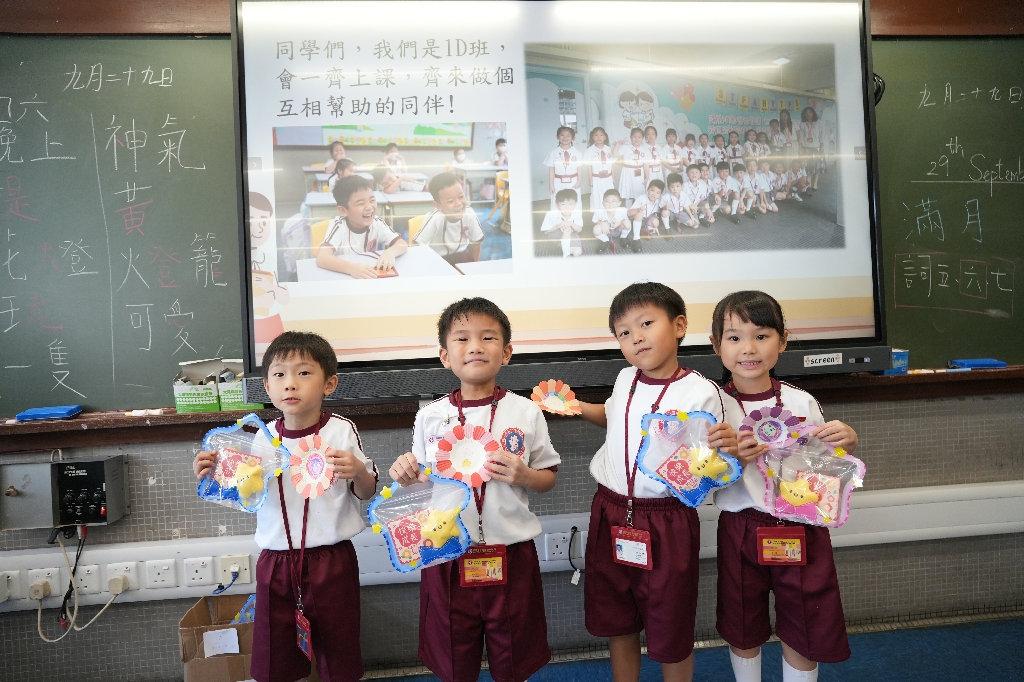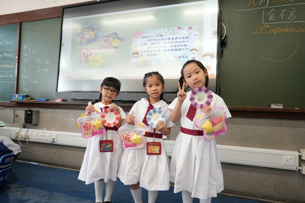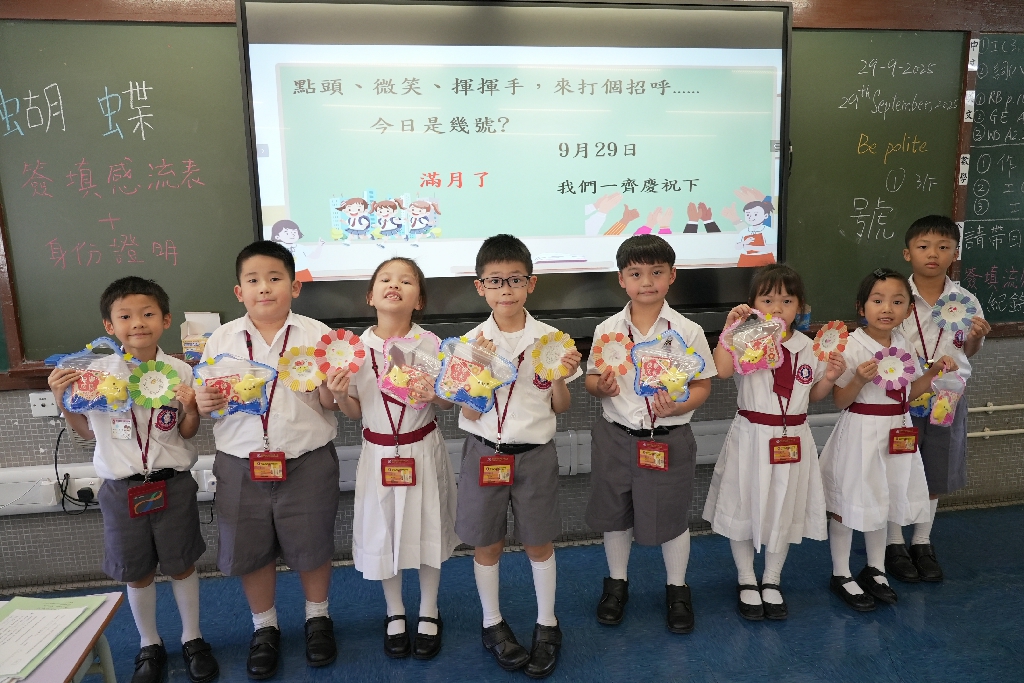 為了慶祝小一同學愉快地融入小學生活,本校輔導組為他們安排了「滿月禮」。當天小一同學懷著興奮的心情,在彩色的紙碟上,寫上支持句語和畫上喜愛的圖畫,互相鼓勵欣賞,增加同學的歸屬感。當日同學還收到一份可愛的小禮物,袋內有一顆星星,提醒他們每一位都是顆閃亮的星星,都有自己的閃光點,要努力發光發亮。