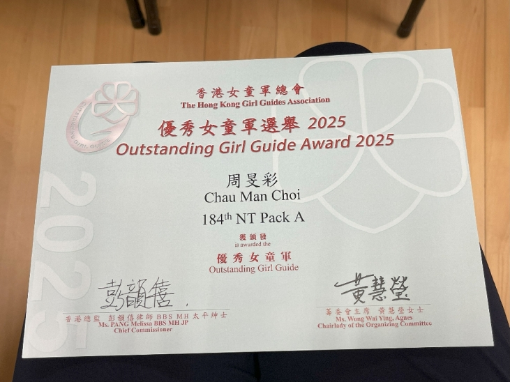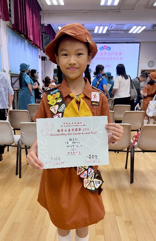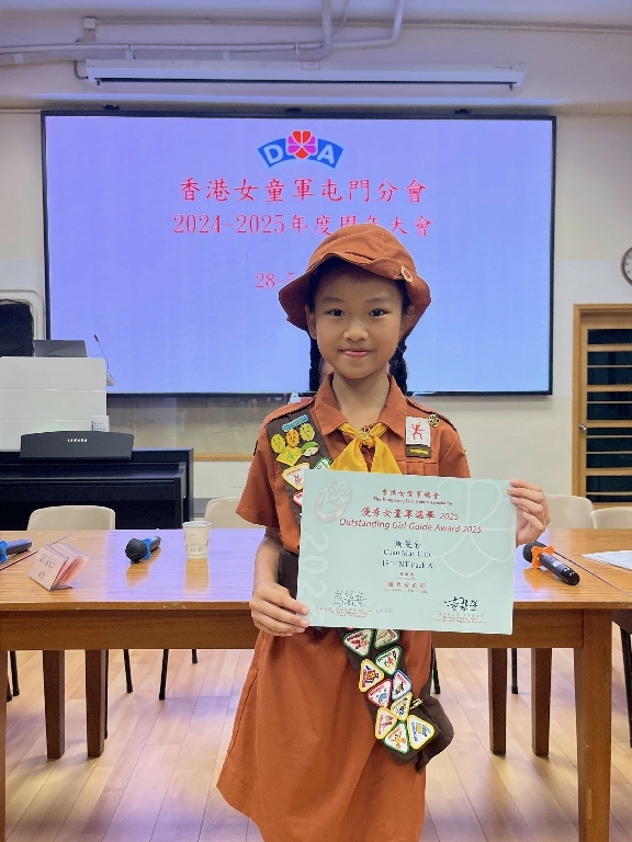 恭喜!恭喜! 本校5E周旻彩榮獲「優秀女童軍選舉2025」之優秀女童軍。她積極參與各項由香港女童軍總會舉辦之活動,在「八項綱領」實踐活動中表現優秀 (包括:享受戶外樂趣、提高警覺、對人友善、幫助別人、幫助料理家務、保持健康、竭盡所能和要有表現),更具備良好的領導才能,能幫助各隊員參與各項活動,實踐小女童軍規律「日行一善」,是一位優秀女童軍。
