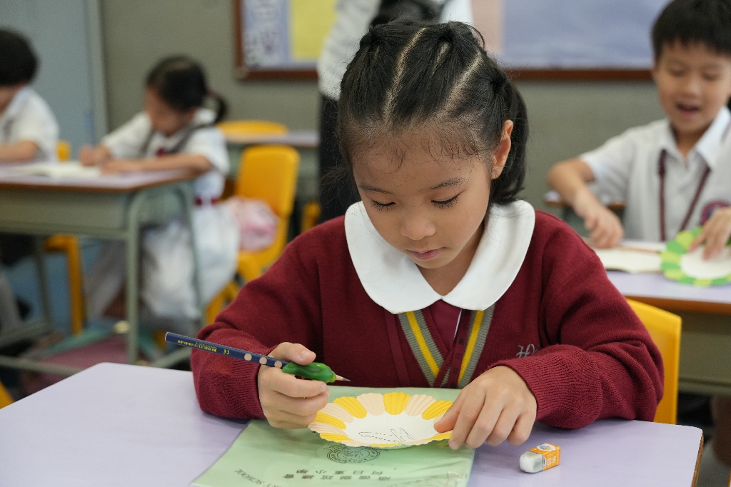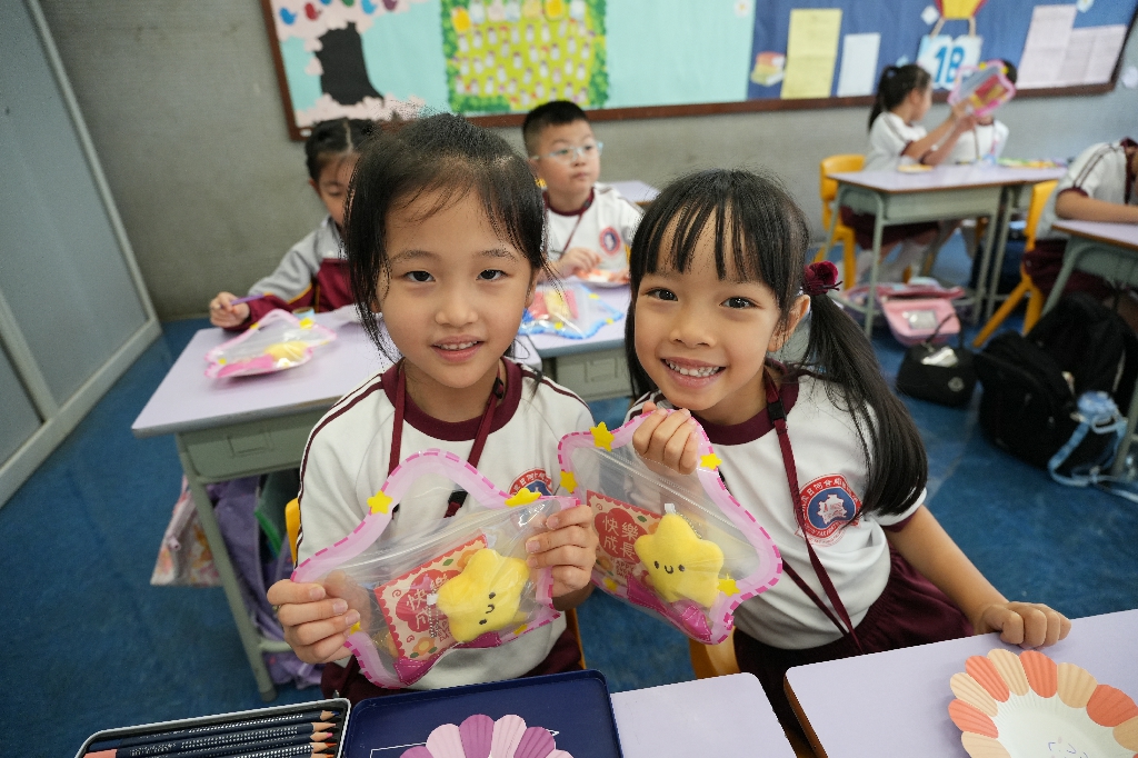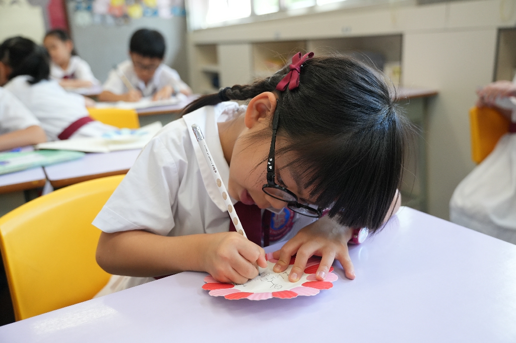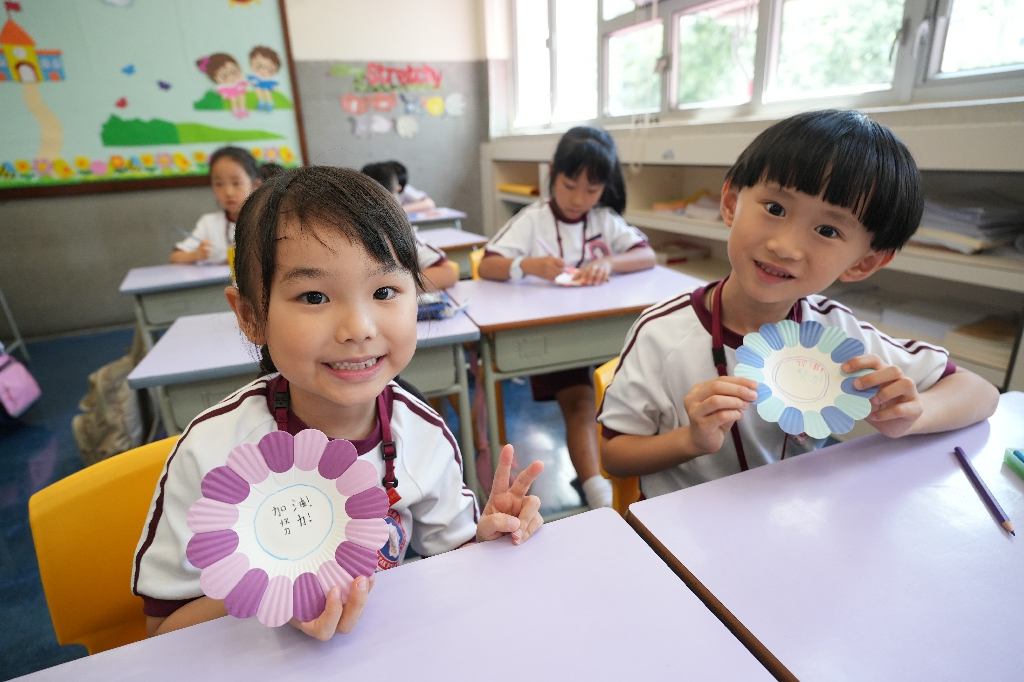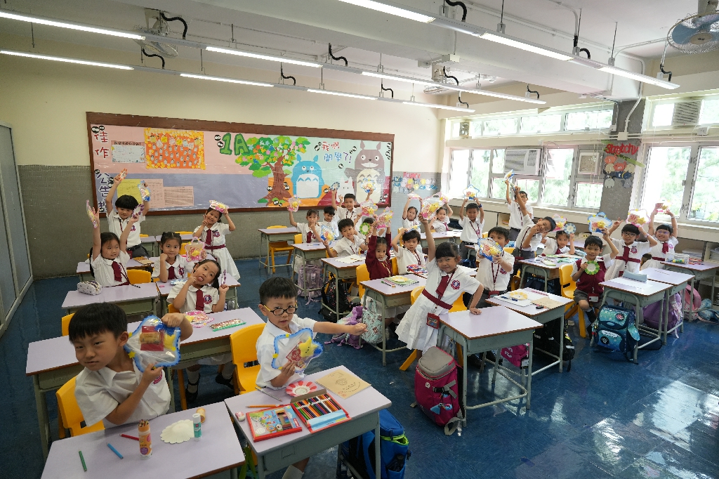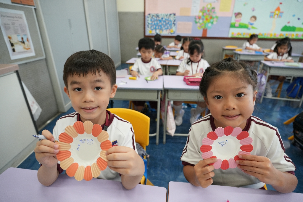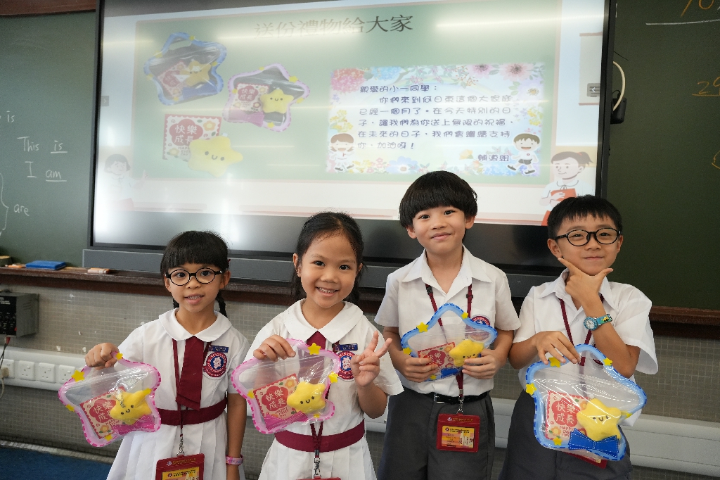 為了慶祝小一同學愉快地融入小學生活,本校輔導組為他們安排了「滿月禮」。當天小一同學懷著興奮的心情,在彩色的紙碟上,寫上支持句語和畫上喜愛的圖畫,互相鼓勵欣賞,增加同學的歸屬感。當日同學還收到一份可愛的小禮物,袋內有一顆星星,提醒他們每一位都是顆閃亮的星星,都有自己的閃光點,要努力發光發亮。