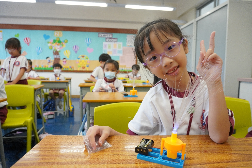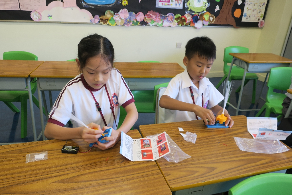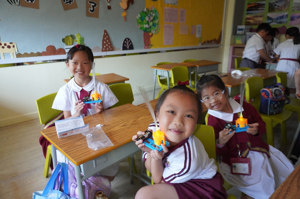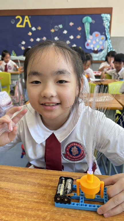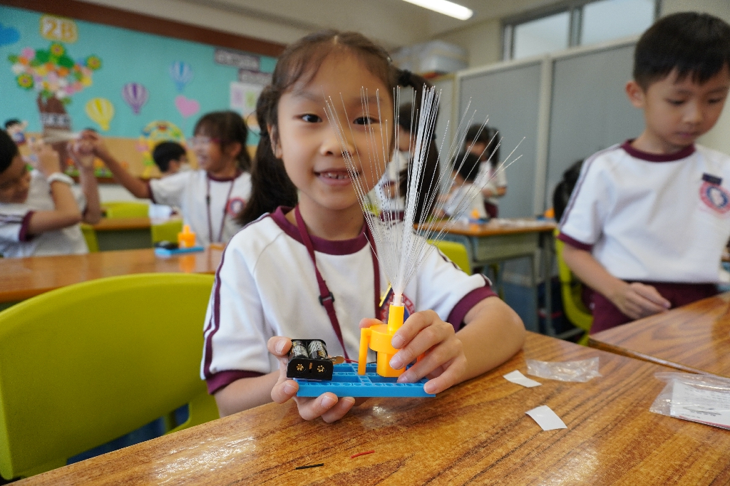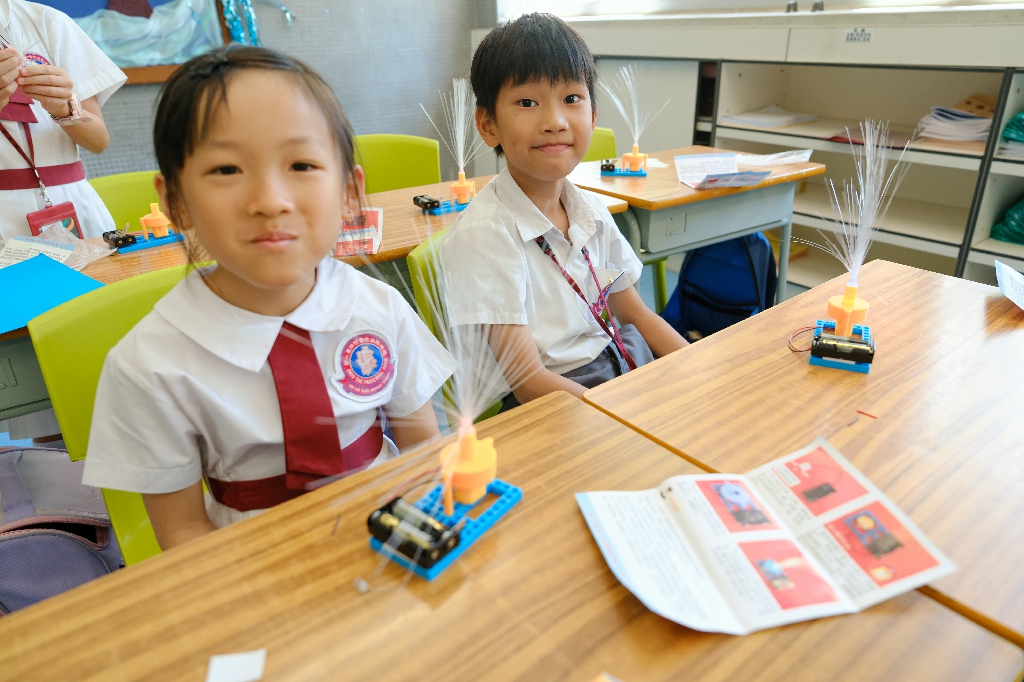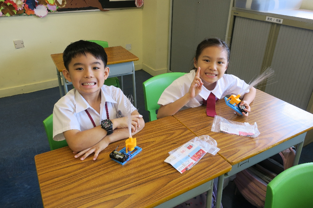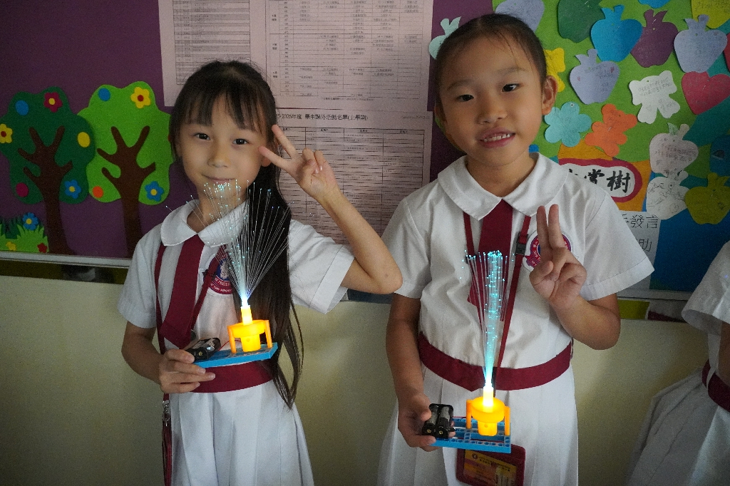 配合常識科課題:自製玩具,學生動手製作新奇有趣的七彩噴射燈,訓練思考和創造力,並學習能量轉換的科學原理。學生製作七彩噴射燈時能享受當中的樂趣。